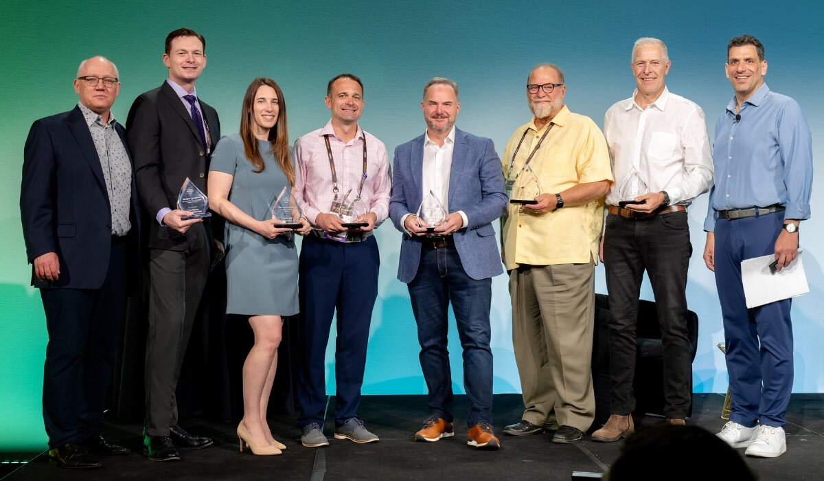 Vizzie Award winners stand alongside Visier executives, from left: Ian Cook (Visier), Gary Russo (Providence), Jillian Feldman (Prudential), Casey Fisher (Micron), Ian McVey (Visier), Steve Rudolf (Baptist Health), Werner Merbold (Standard Bank Group), Paul Rubenstein (Visier)