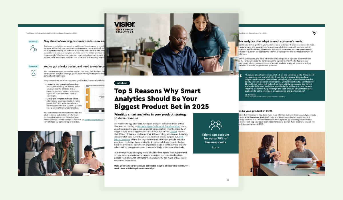 Betterworks, a leader in performance management, sought to help its customers more easily make data-driven decisions by integrating powerful analytics capabilities into the Betterworks platform. By partnering with Visier, Betterworks empowered their customers with a robust, customizable analytics solution that delivers insights, including program adoption, employee performance, and DEIB initiatives. These insights give HR teams valuable, actionable insights into program impact and workforce trends.